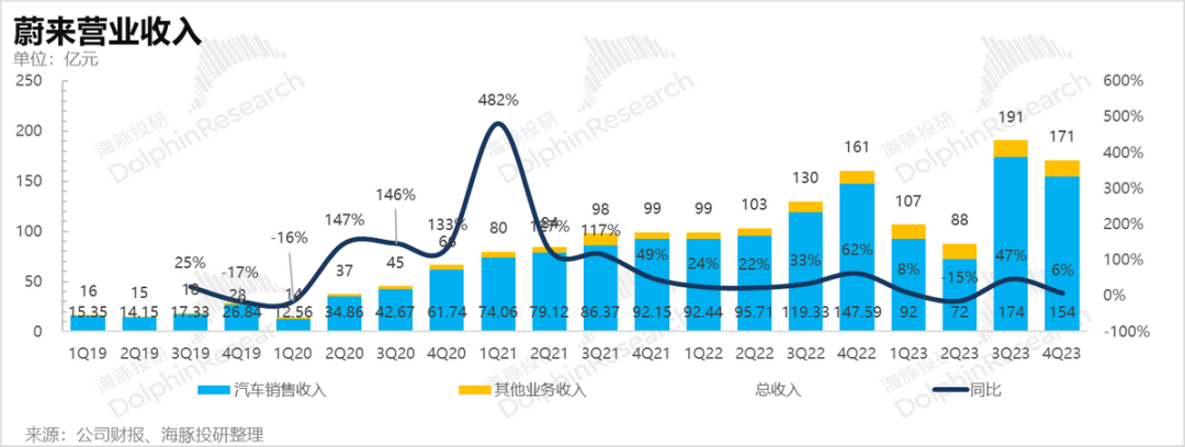 蔚来四季度整体收入171亿,同比上升了6.5%,略低于市场预期172.5亿。