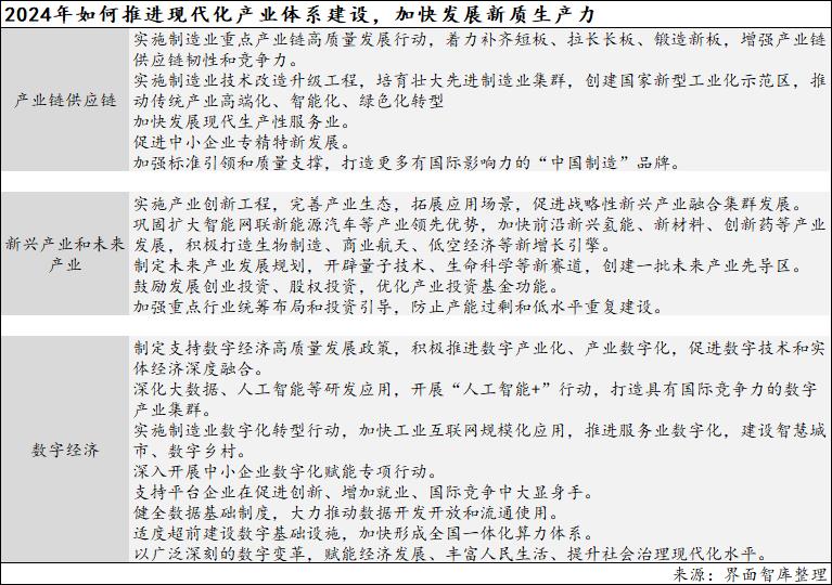 今年在现代化产业体系建设方面,主要围绕三个方向展开——产业链供应链、新兴产业和未来产业、数字经济(具体安排见下图)。