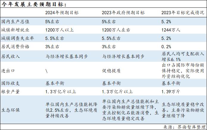此外,GDP的预期目标略高于目前市场对2024年GDP增长预测值(国内市场研究机构预期均值不足4.8%,IMF与世界银行预测值分别为4.6%、4.5%)。据《政府工作报告》起草组负责人、国务院研究室主任黄守宏解释,设定这一目标值兼顾了短期和中长期,也兼顾了需要和可能,实现这一目标有条件也有支撑。
