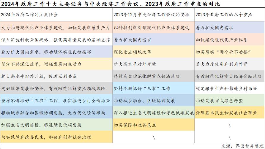 界面智库发现,与2023年的政府工作报告相比,今年的政府工作安排出现了以下十个变化: