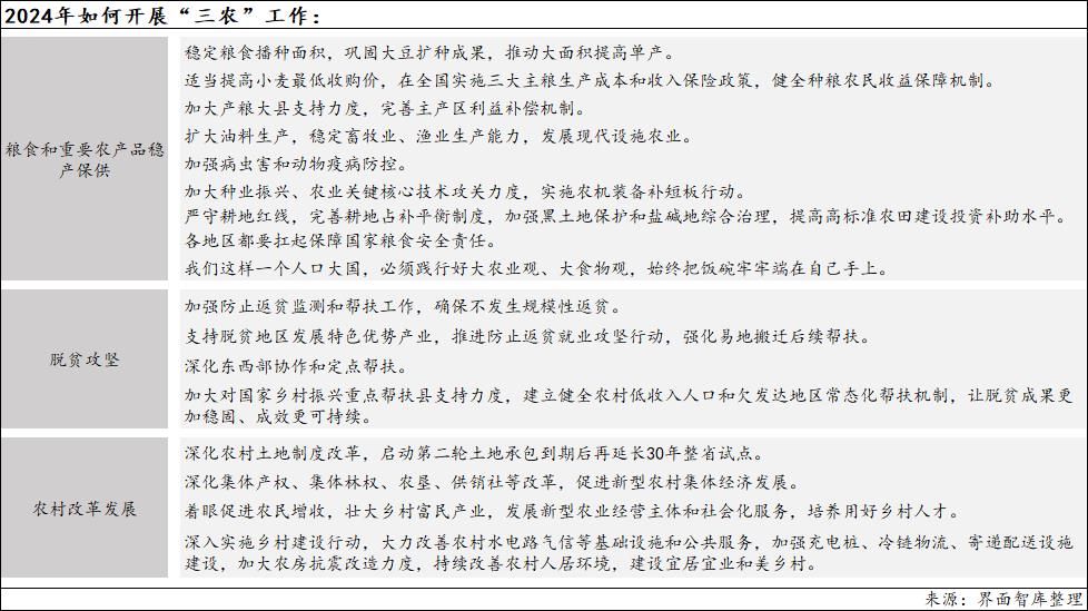 十是对“三农”的支持力度明显加大。2023年政府工作报告还未反映出大农业观与大食物观,今年则已经从粮食安全拓展到重要农产品的稳产保供。对于脱贫攻坚成果的巩固,今年也提供了更多政策方向,从监测到帮扶、从产业到就业,从协作到帮扶,明确要建立常态化机制。对于农村,今年新增了改革的部分,既有土地制度的改革,也有促进新型农村集体经济发展的改革。