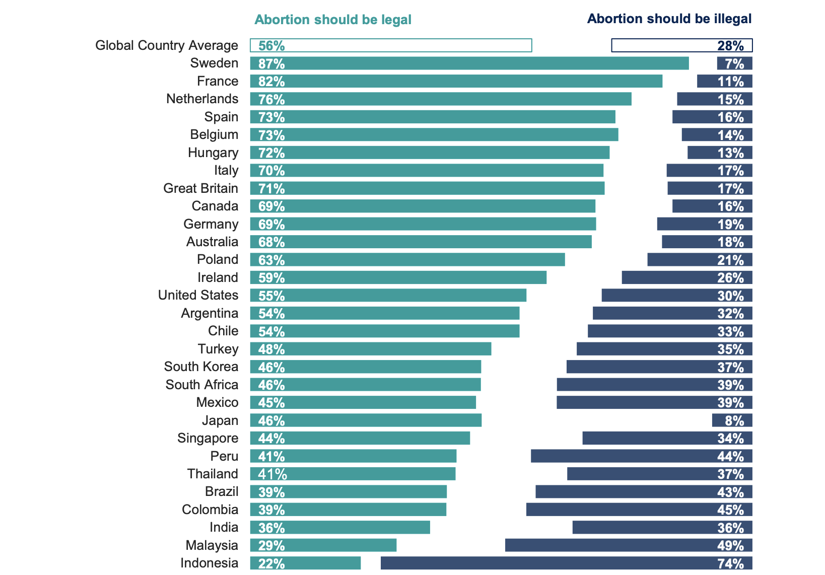 2023年一项针对29个国家居民的抽样调查显示,超一半(56%)的受访者认为堕胎应合法化,近三成(28%)持相反态度。另外,多数人反对怀孕20周之后进行堕胎。受访者的立场往往取决于宗教影响、文化背景以及受教育程度。