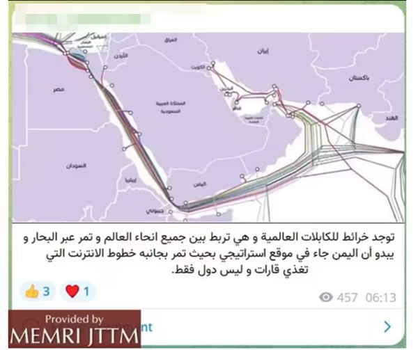 此前,与胡塞武装内战的也门政府警告称,胡塞武装可能会对红海的水下通信电缆实施破坏。中东媒体研究院圣战及恐怖主义威胁监控项目的追踪发现,去年12月,与胡塞武装有关的Telegram账号发布了一张地图,图中显示的正是红海、地中海、阿拉伯海和波斯湾的水下通信电缆网络。