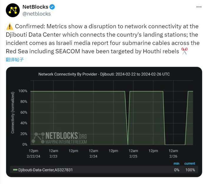 截至目前,红海水下电缆受损事件没有对全球通讯造成明显影响。网络监测机构Netbocks的跟踪显示,红海沿岸东非国家吉布提的数据中心在上周一出现了数小时的网络中断,后恢复正常。