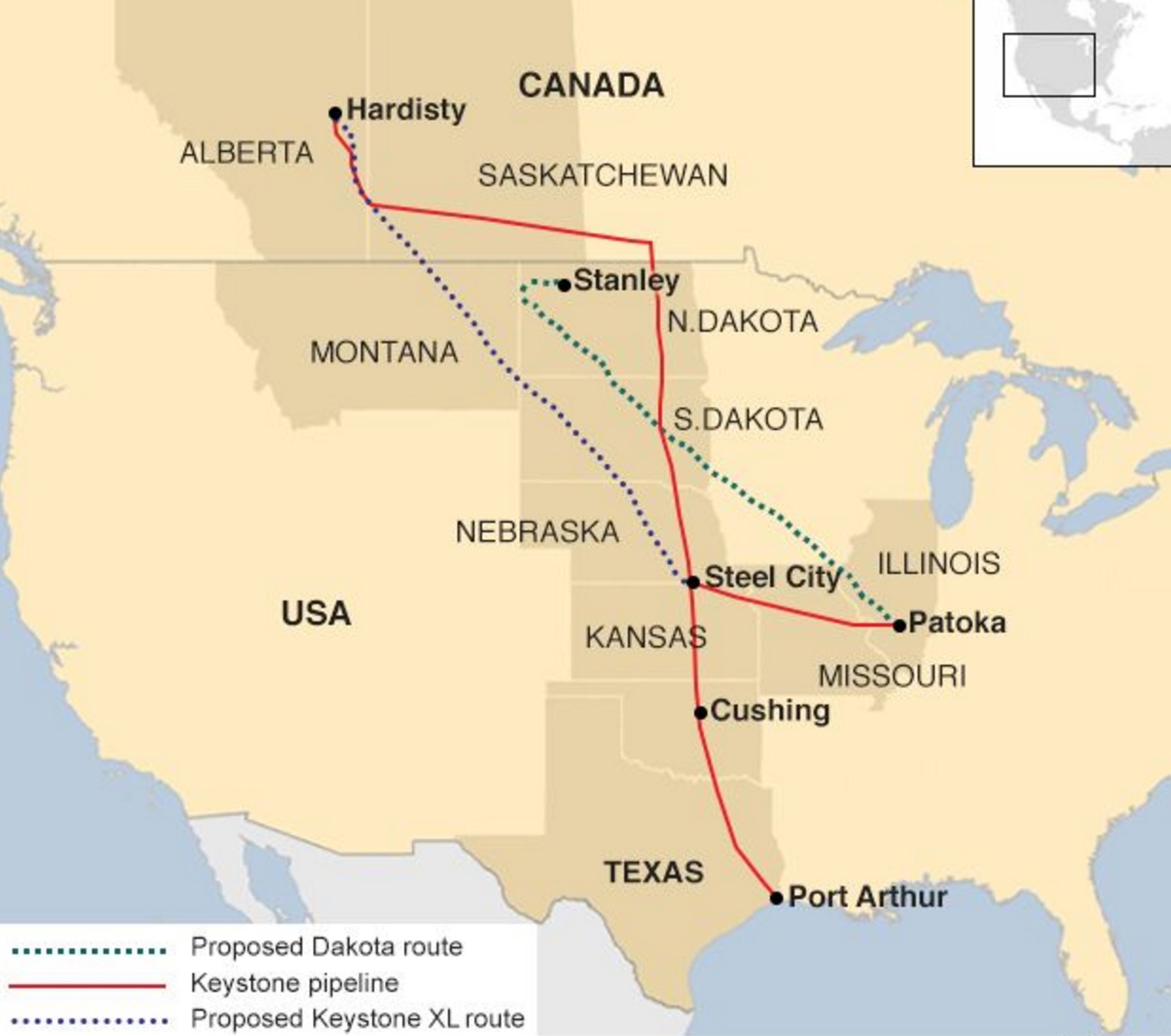 Keystone XL输油管项目是建设一条将加拿大阿尔伯塔省生产的重油运送美国内布拉斯加州斯蒂尔市(Steele City)一条输油管道,总投资额为61亿美元,可输送加拿大出口至美国原油总量的四分之一。管道全长1897公里,并在斯蒂尔市并入已有的输油管道,将重油输送到德克萨斯州墨西哥湾地区炼油厂。