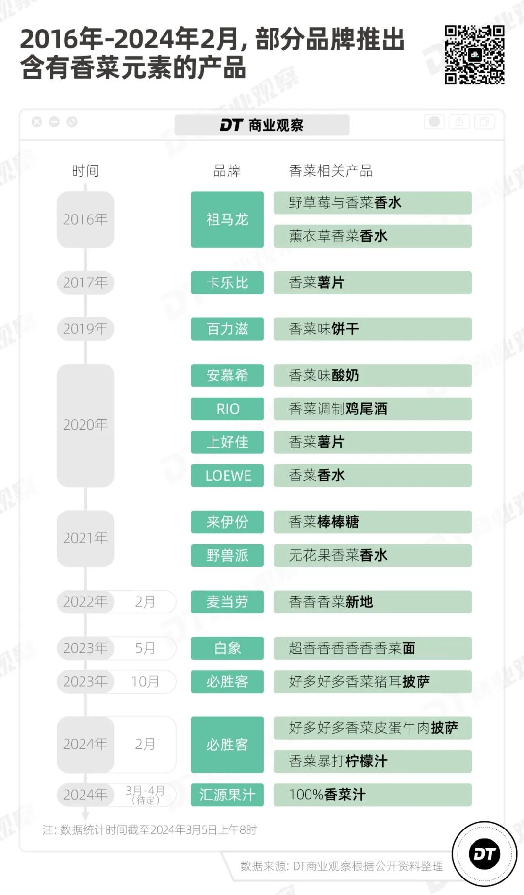《DT商业观察》按时间顺序整理了部分品牌推出的香菜产品,发现它们主要有两个特点。