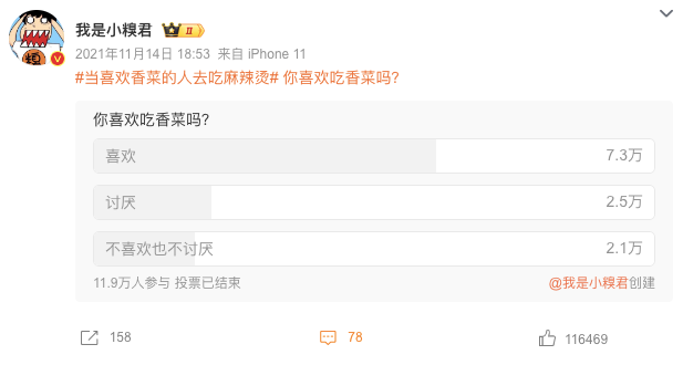 但参照2021年微博大V @我是小糗君 发起的投票,会在网上发表自己对香菜喜恶的人群比例可能更小。在11.9万人参与的投票结果中,喜欢香菜和讨厌香菜的人群比例大概是3:1。