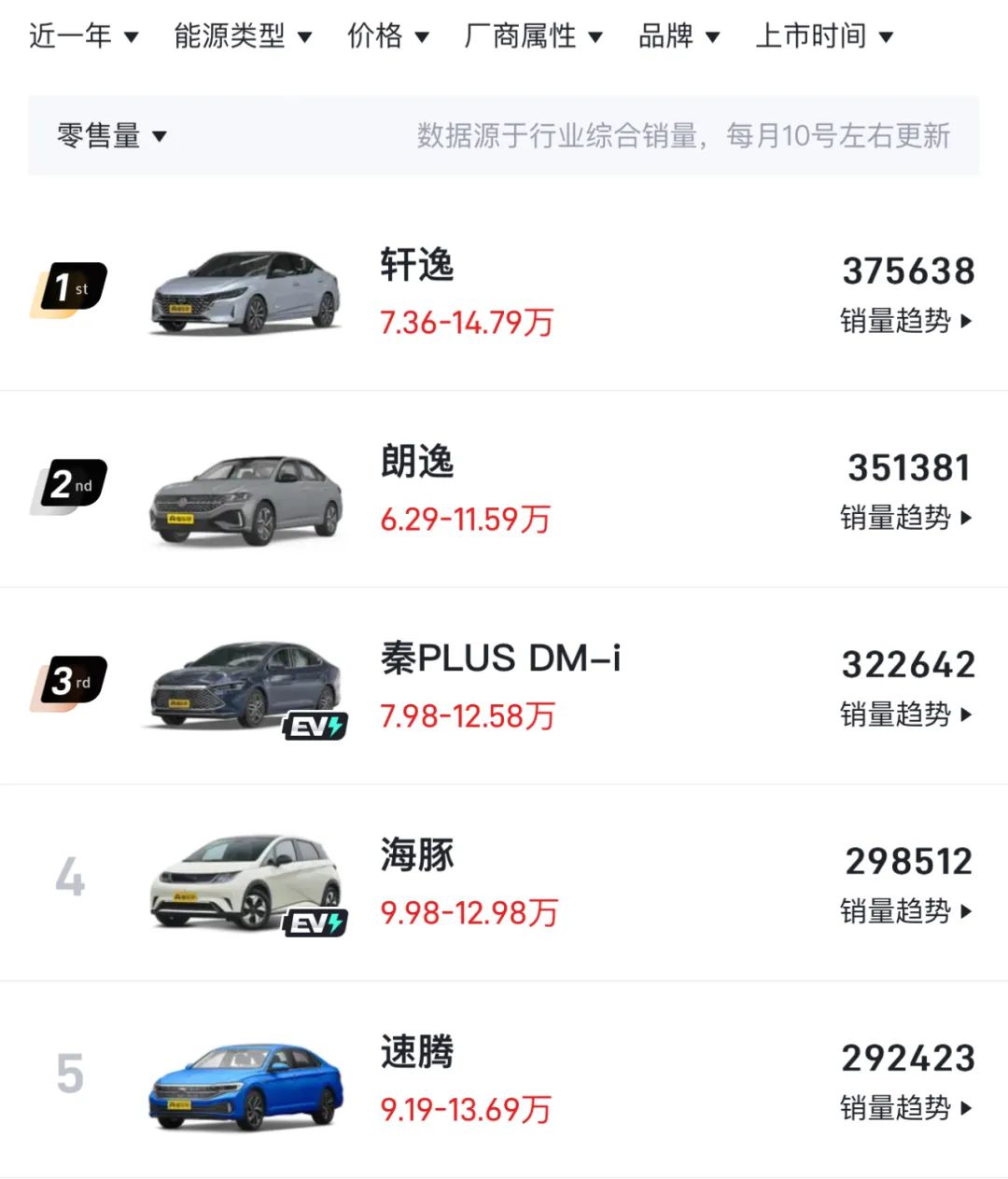 表面来看,整个2023年是新能源汽车占据上风,然而在比较大众化的A级轿车市场,根据懂车帝发布的统计数据,过去一年销量最高的是日产轩逸和大众朗逸,分别为37.6万辆和35.1万辆,比亚迪秦PLUS以32.3万辆的销量屈居第三。