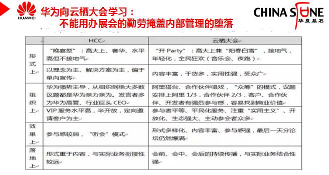一条条比较下来,华为到底要向阿里学什么?总共五个点。第一,要学习云栖大会源于互联网的平等、活力和年轻化,形式要学,灵魂更要学。其次,要学习云栖大会组织上的“实用主义”“商业至上”。第三,云栖大会办会的全员参与和众筹模式也值得借鉴。第四,在传播上也可以学:花小钱,办盛会。第五,云栖大会的闭环管理尤其值得学习。举这个例子是为了说明,华为是一个非常善于学习的组织。能够做到今天这么大,还能持续成长,就是源于它的学习能力和开放、谦虚、自我批判的精神。