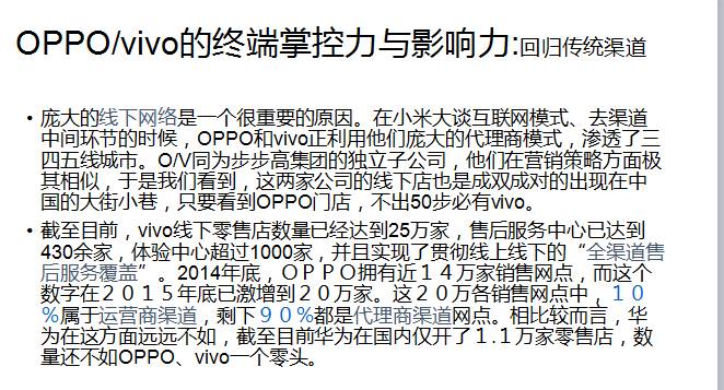 其次,就是强大的终端掌控力和影响力。这最早是程绍珊老师去步步高做的,本质上就是把传统的深度分销做到位。OPPO建立了庞大的线下销售体系,14年已经到达了25万家销售点,跟小米去渠道、去中间环节相反,OPPO恰恰是在终端下大力气,真正贯彻了线上线下、“全渠道售后服务”的全覆盖。即便是在三四线城市,OPPO、vivo店到处都是。包老师最早提出了深度分销的理念,OPPO是真正把它做到位了。
