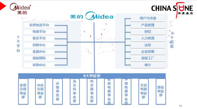 美的新的组织架构,叫做“789”新架构,是方洪波从15年6月到16年整合完成的。就是所谓去中心化、去权威化、去科层化的内部组织改革,构建了7大平台、8大职能和9大事业群体为主体脉络的架构。通过这种改革,使得前端平台人员拥有较大的自主权力和自我判断能力,而后端也越来越尊重前端平台人员的提案和决策。传统的部门制已经被打破,在这个平台里面,所有人的工作都是平行的,没有层级结构。在业务层面上,按照研产销进行专业化分工,进行职能平台的整合与管理。从管理学角度来说,美的“789”新架构是值得去研究的,而且目前运行非常好。过去集团总部是按照专业职能进行划分,比如人力资源部、财务部、战略部、企业文化部,美的的改革实质上把很多共享的平台提到了集团层面,即所谓的“平台化”组织。我们说打造“平台化”组织,就必须要有支撑。美的有物流平台、电商平台、售后平台、创新中心、金融中心、美的国际、采购中心,这些对所有事业部都是共享的平台。