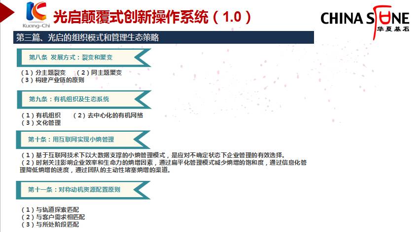 光启的组织模式、生态系统和提出的组织管理理论,今天看来是具有前瞻性的,确实颠覆了过去的组织模式、商业模式。尤其是光启最先提出的组织内部的裂变与聚变、有机组织与生态组织、用互联网实现小熵管理,这也是任正非最近在谈的第二热力定律理论,就是小熵的管理。
