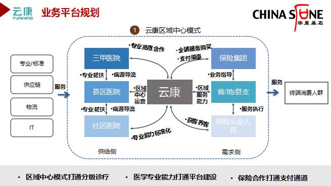 云康模式是要构建分级诊疗和健康服务的立体交互网络,横向以六大业务平台为基础,整合医疗行业资源,用医学标准构建覆盖全国的服务网络;纵向以专业和疾病谱分类,构建分级诊疗网络,由诊断向治疗和康复延伸。