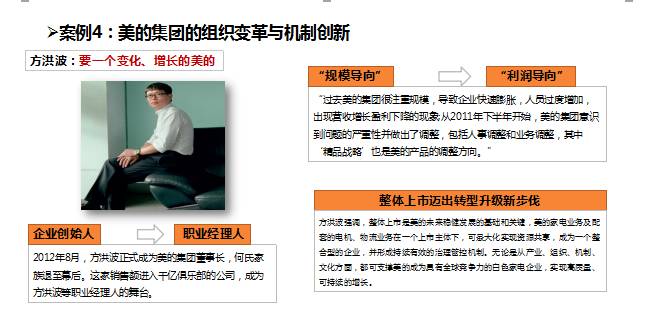 所谓去中心化、去权威化,不是简单去放权,而是要按照规则、按照方向去给一线的人授权,同时要在一线呼唤炮火的时候给予支援。如果总部没有一个强有力的、基于信息化的平台资源配置中心,你没法去呼唤炮火,企业内部还是个体户的集中营。所以,大家不要小瞧上面这张图,它其实代表了未来组织变革的方向。而且,美的改革,从15年到现在,度过了转型的困难期,应该说是成功的。最难的一步就是在总部建立平台,平台的管理就不再是基于行政命令,而是基于流程。现在很多企业说去行政化、去威权化,要怎么去?其实很多东西要往上拎,有些东西要往下走,这就是我们说的数据要往上移,资源配置系统要往上提,责权体系要往下沉。这是美的值得我们关注的地方。