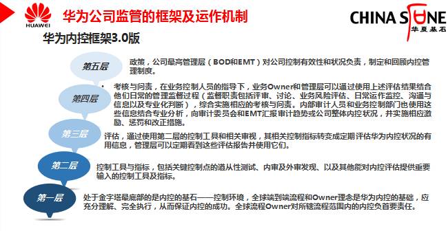 另外,虽然华为授权力度很大,但监管体系是很严格的。华为一直在构建监管重装旅的监管体系,明确最重要的监管责任在业务主管和流程Owner,解决95%的问题,强调对整个业务流程和干部工作行为的监督。所以,华为现在十几万员工,之所以不出乱子,最关键的就是重装旅的监控体系。而这种监控体系不是要抓特务,而是通过流程,通过责任体系的建立,通过风险的识别,把问题消灭在过程之中。最重要的是建立了整个公司的内控体系、责任体系,从政策到考核问责,到基于流程的评估,再到控制工具和方法,再到整个环境的控制,这种基于流程来打造的组织系统,应该是现在很多企业都不具备的。华为的内控系统分为五个层面:第一个层面主要是公司制度层面,第二是通过考核与问责来定性,第三个层面是评估,第四个层面是控制工具和指标,第五个层面是控制环境。从而真正建立了公司三层防线的监控体系框架。