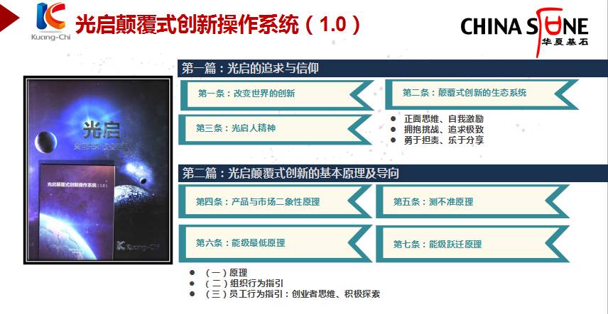 在此之外,它的商业模式、组织模式还是有很多创新。我们专门为光启做了《颠覆性创新操作系统》1.0版本,明年还要出深入研究的版本。这是对标《华为基本法》,去做一个超越性的真正的高科技企业案例。颠覆性创新理念是光启进行源头创新的精神动力。目前中国市场竞争激烈,各行业趋于饱和,“空白市场”越来越少。光启通过颠覆性创新理念,源头创新技术,人为开辟了“空白市场”,为光启未来的发展打造了一片蓝海。