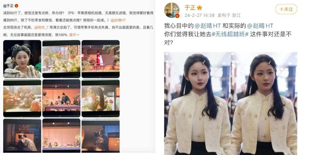 深谙流量密码的于正老师,这阵子为了捧自家小花,可谓绞尽脑汁。几乎每隔几日就要拿赵晴的照片刷屏,配图言论更是精准踩在大众雷区。先是称“瘦到92斤有点胖”,被网友怒怼白瘦幼畸形审美。接着又亲自把赵晴的生图P成网红风,给本就深陷“照骗”舆论的赵晴火上浇油。