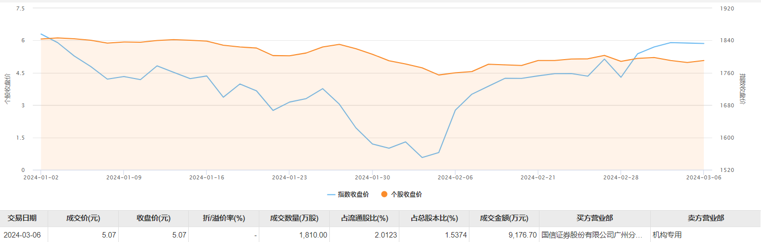 科顺股份3月6日大宗交易成交1810万股,成交额9176.7万元,占当日总成交额的55.2%,成交价5.07元,较市场收盘价5.07元持平。