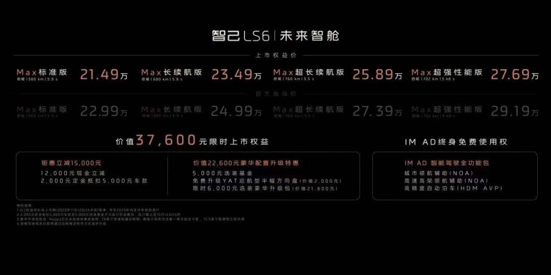 2023年10月,智己的第三款车型LS6迎来“上市即交付”,21.49万元-27.69万元的最终定价直接将上市前盲订的3万车主迅速转化成智己LS6的首批车主。