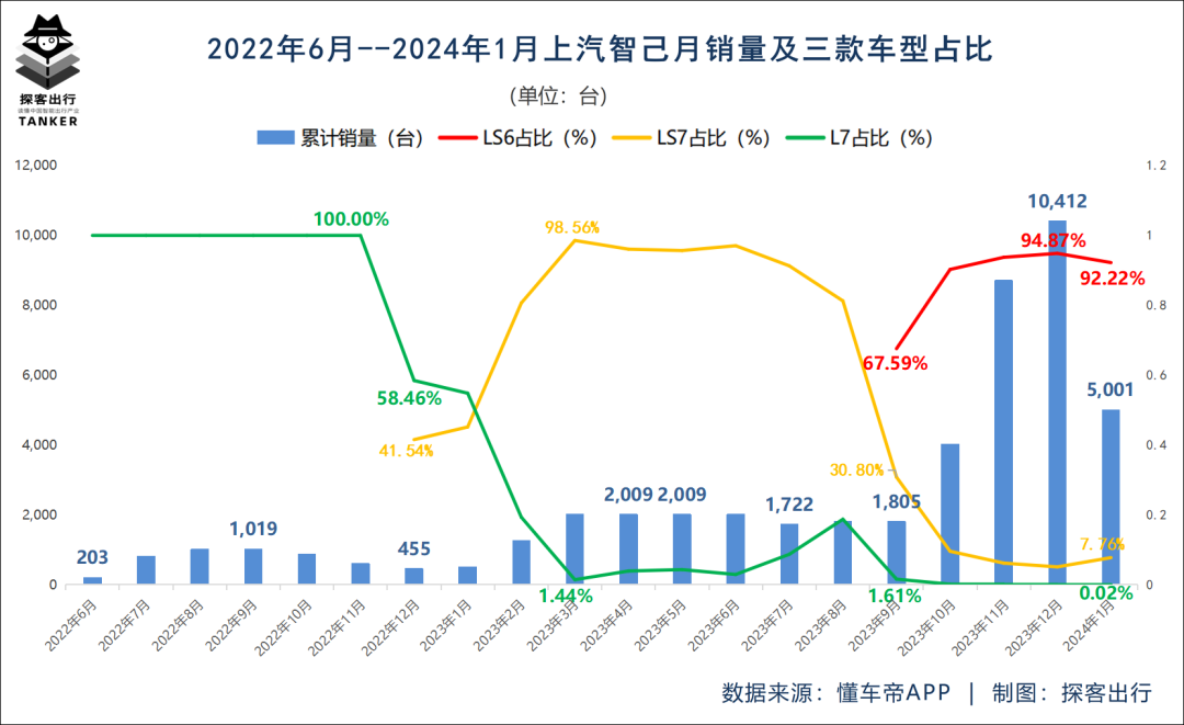 懂车帝数据显示,2024年1月智己汽车品牌单月销量约5001台。其中,智己LS6单车贡献了4612台,占当月总销量的92.22%。智己LS7单月仅卖出了388台,约占当月总销量的7.76%,而智己L7在连续四个月销量低至个位数后,1月销量更是仅卖出了1台新车,占比低至0.02%。