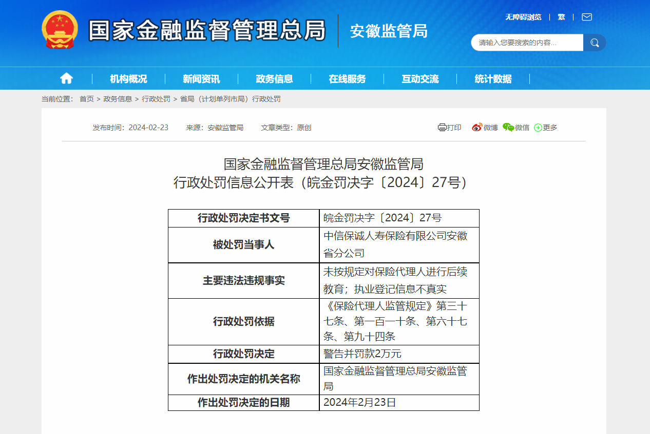 据国家金融监督管理总局安徽监管局官网显示,近日,中信保诚人寿保险有限公司安徽省分公司因未按规定对保险代理人进行后续教育;执业登记信息不真实,违反了《保险代理人监管规定》第三十七条、第一百一十条、第六十七条、第九十四条,被国家金融监督管理总局安徽监管局罚款2万元。