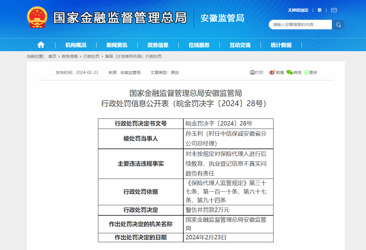 同时,时任中信保诚安徽省分公司总经理孙玉利,因对未按规定对保险代理人进行后续教育、执业登记信息不真实问题负有责任,违反了《保险代理人监管规定》第三十七条、第一百一十条、第六十七条、第九十四条,被国家金融监督管理总局安徽监管局,警告并处罚款2万元。