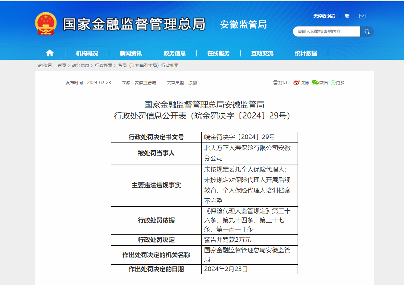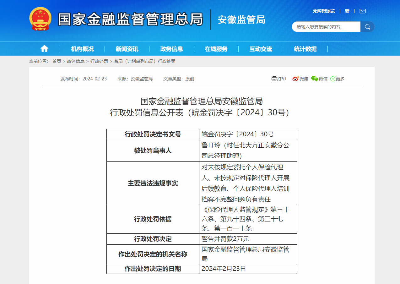 同时,时任北大方正安徽分公司总经理助理鲁玎玲,因对未按规定委托个人保险代理人、未按规定对保险代理人开展后续教育、个人保险代理人培训档案不完整问题负有责任,违反了《保险代理人监管规定》第三十六条、第九十四条、第三十七条、第一百一十条,被国家金融监督管理总局安徽监管局,警告并处罚款2万元。
