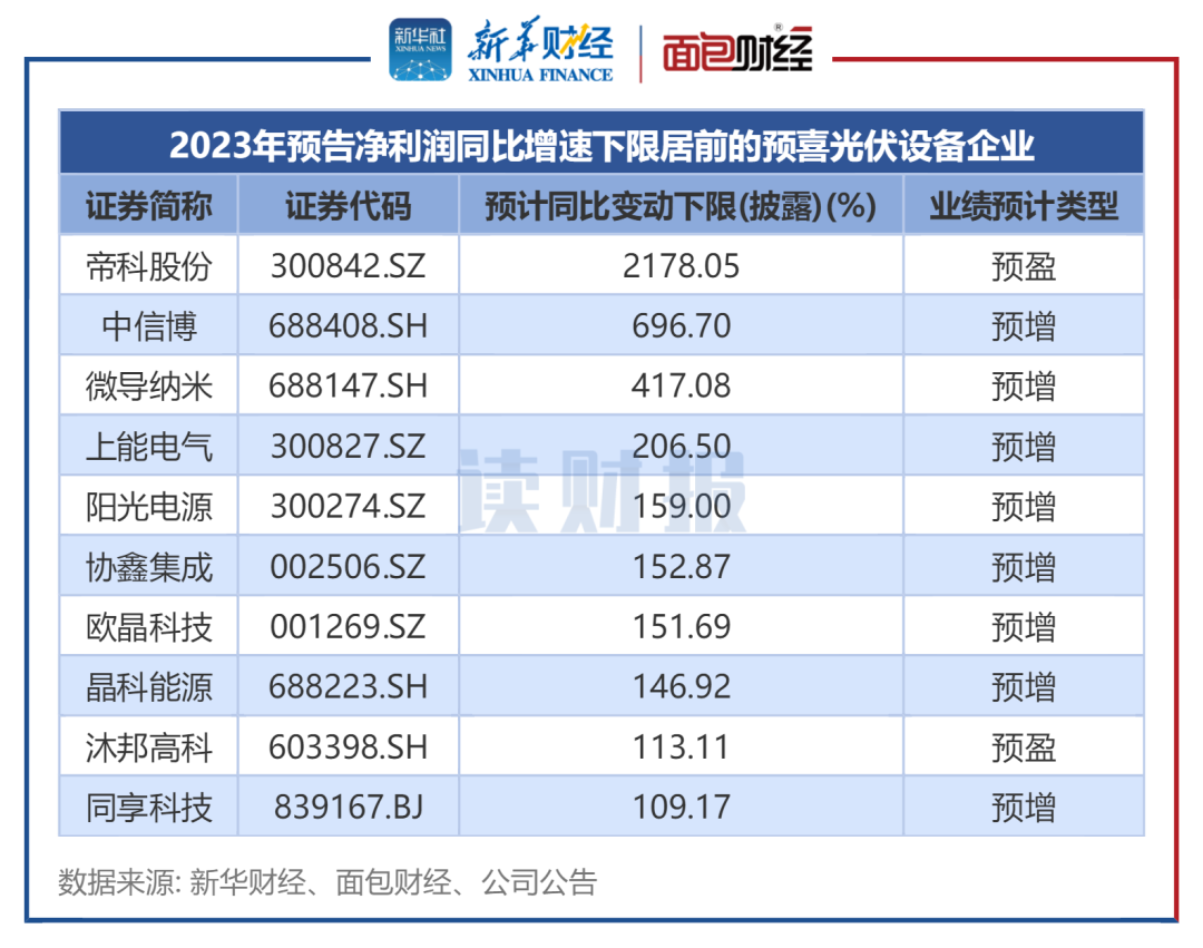 公告显示,帝科股份2023年实现扭亏为盈,归母净利润为3.60亿元至4.00亿元;中信博预计2023年归母净利润为3.54亿元,同比增长约696.70%;微导纳米预计2023年归母净利润为2.80亿元,同比增长约417.08%。
