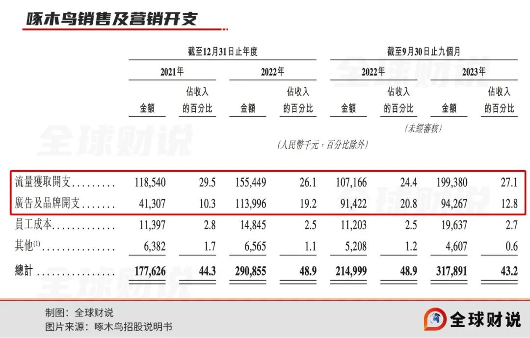 2021年至2022年及2023年前三季度,啄木鸟维修的销售及营销开支分别为1.78亿元、2.91亿元及3.18亿元,分别占同期总收入的44.3%、48.9%及43.2%。其中,超9成营销开支来自于流量获取、广告及品牌宣传。