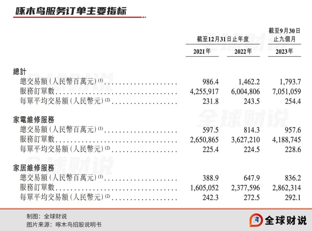 根据灼识咨询数据,啄木鸟维修是中国最大的家庭维修平台。2023年前三季度,啄木鸟平台有逾700万单交易,合计总交易额17.9亿元。