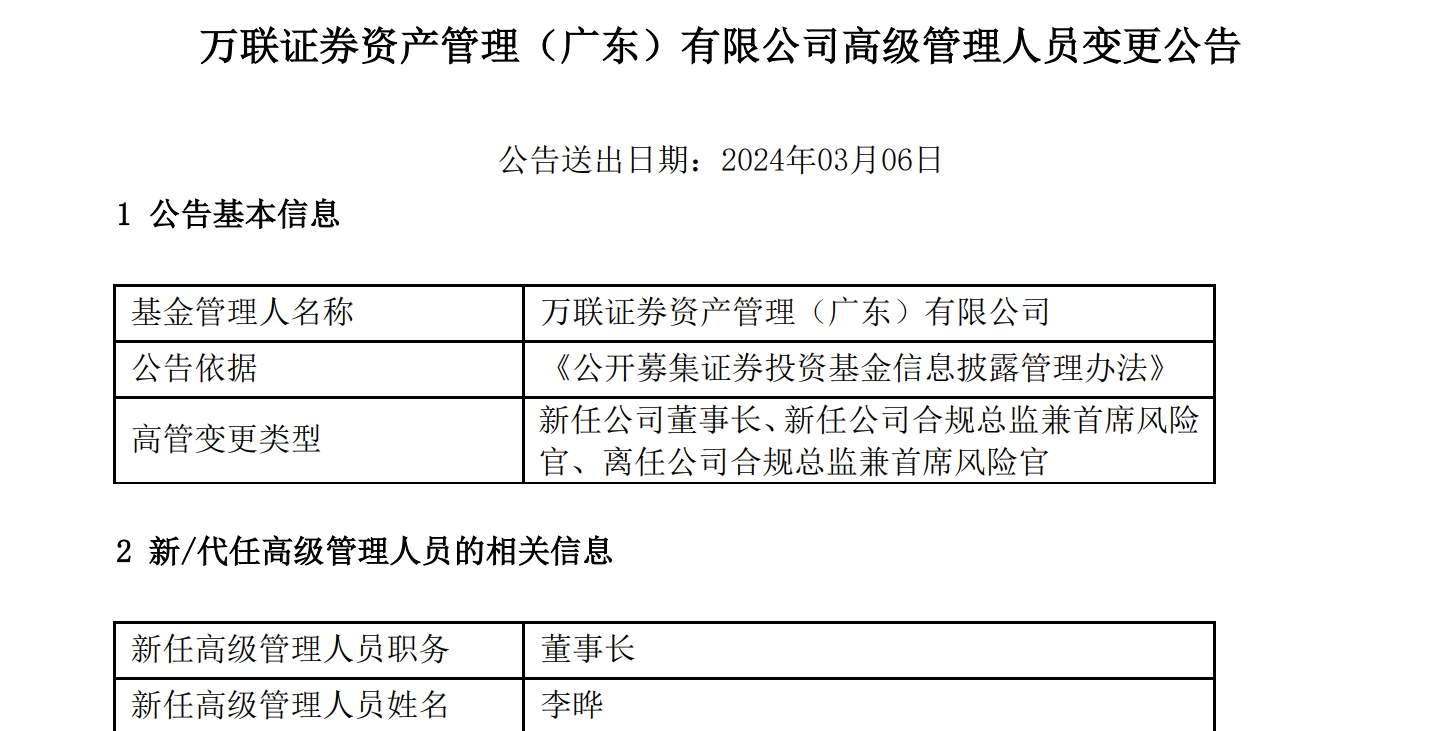 3月6日,万联证券资产管理(广东)有限公司(下称:万联资管)发布高管变更公告,现任总经理李晔于3月5日起正式出任董事长工作。
