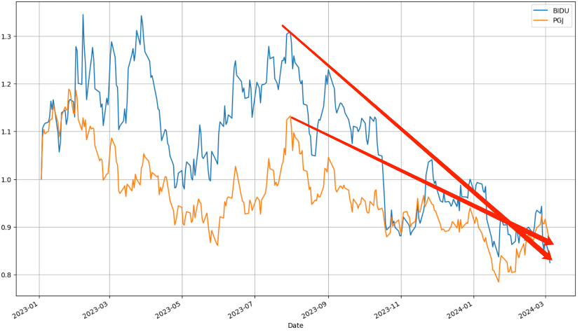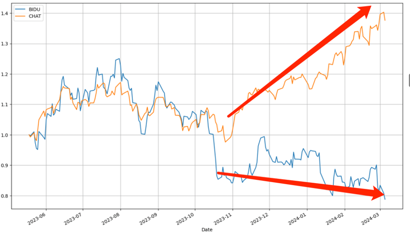上述图表中,两条折线起初确实保持了高度的相关性,ChatGPT概念对百度的加持是明显,2023年10月之后百度开始一蹶不振,而行业指数仍在上升。