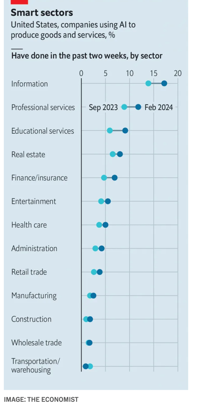 《经济学人》近期披露了美国代表行业的AI使用率,在过去一年普及率最高且进展最快的行业仍然是互联网行业最早形态的信息产业,且越是传统的行业普及率越低,大多数在5%-10%之间。