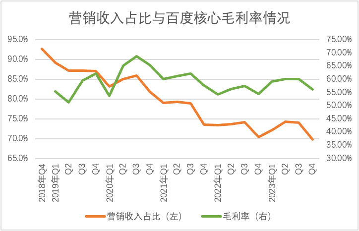 在过去几年百度毛利率随着营销收入占比的下降而下降,直到2022年中之后,毛利率表现相对稳定,同期营销收入占比仍在下降,也就是说创新业务的经营效率是在改善中的,对集团整体的“拖累感”得到缓释。