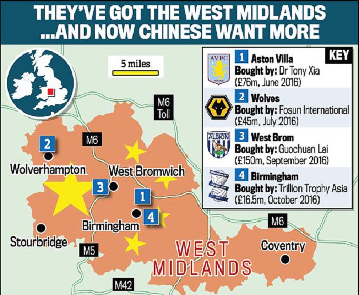 来自英超和英冠的四支球队现在已经为中国人所有,正如下图所示,他们分别是阿斯顿维拉、狼队、西布罗姆维奇和伯明翰: