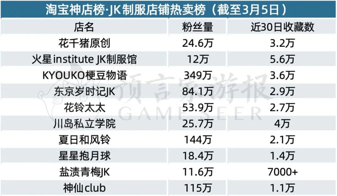 JK制服热卖榜榜首仍然是花千猪原创,火星institute JK制服馆和KYOUKO梗豆物语紧随其后。其余在榜的JK制服店铺分别是:东京岁时记JK、花铃太太、川岛私立学院、夏日和风铃、星星抱月球、盐渍青梅JK和神仙club。