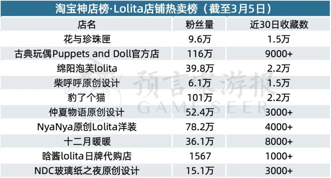 其他在榜的Lolita店铺分别是:柴呼呼原创设计、豹了个猫、仲夏物语原创设计、NyaNya原创Lolita洋装、十二月暖暖、晗酱lolita日牌代购店和NDC玻璃纸之夜原创设计。