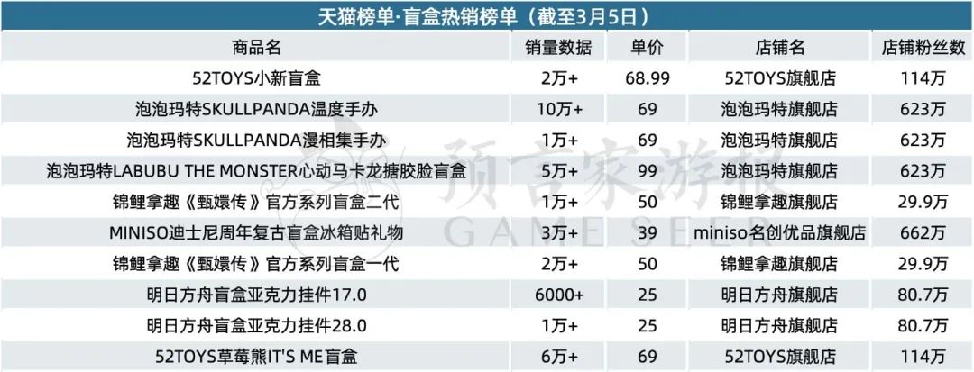此外,明日方舟盲盒亚克力挂件17.0和28.0版本、MINISO迪士尼周年复古盲盒也均有上榜。