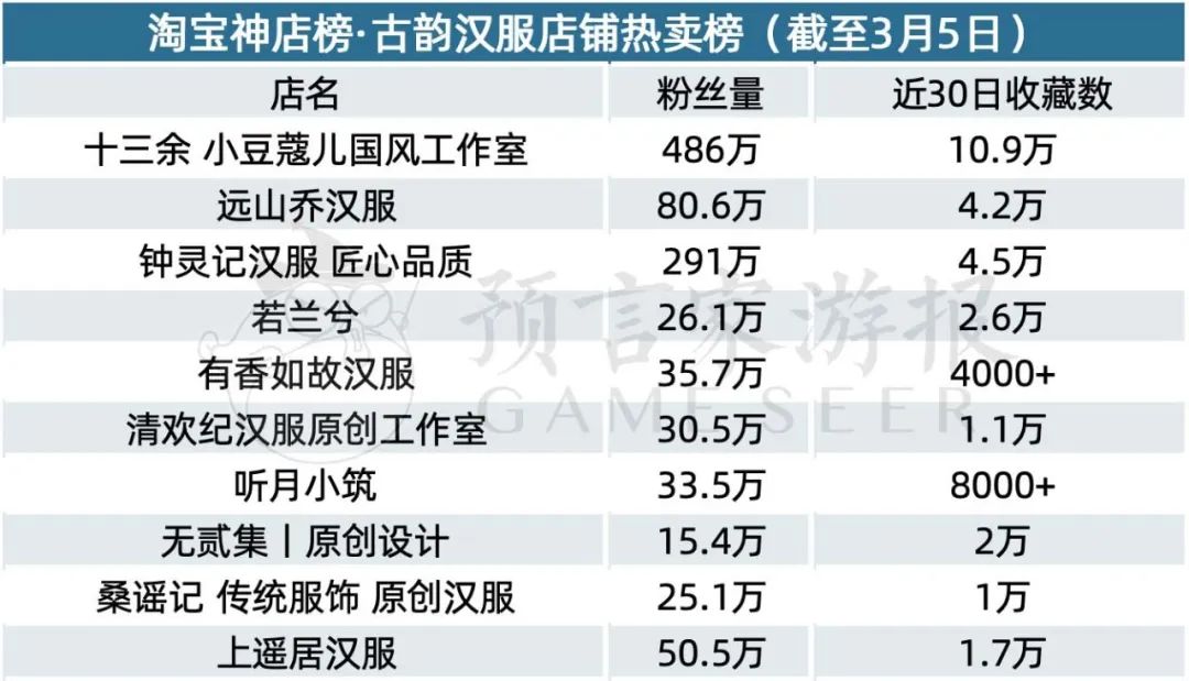 其余在榜店铺分别是:若兰兮、有香如故汉服、清欢纪汉服原创工作室、听月小筑、无贰集丨原创设计、桑谣记 传统服饰 原创汉服和上遥居汉服。