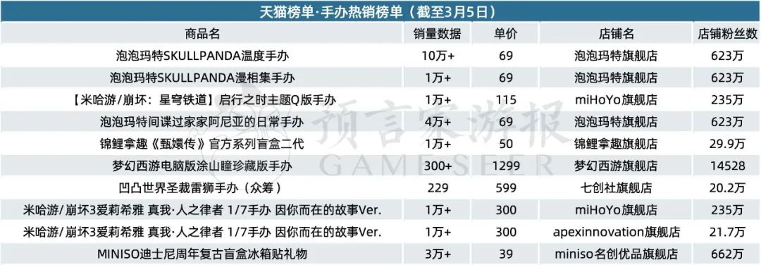 《梦幻西游》涂山瞳珍藏版手办闯入榜单,该手办月销仅300+,但单价为1299元,拉高了总销售额,证实了客单价高的产品仍能收获情怀买手的青睐。