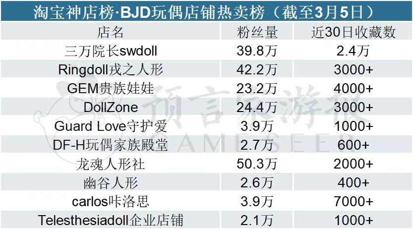 其余在榜的BJD玩偶店铺分别是:Ringdoll戎之人形、GEM贵族娃娃、DollZone、Guard Love守护爱、DF-H玩偶家族殿堂、龙魂人形社、幽谷人形、carlos咔洛思和Telesthesiadoll企业店铺。