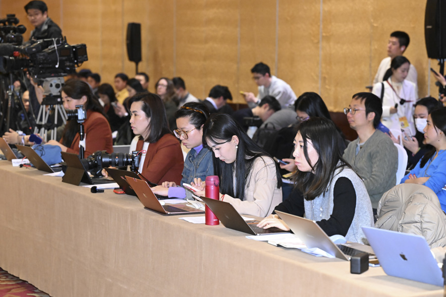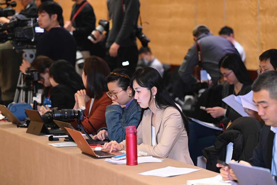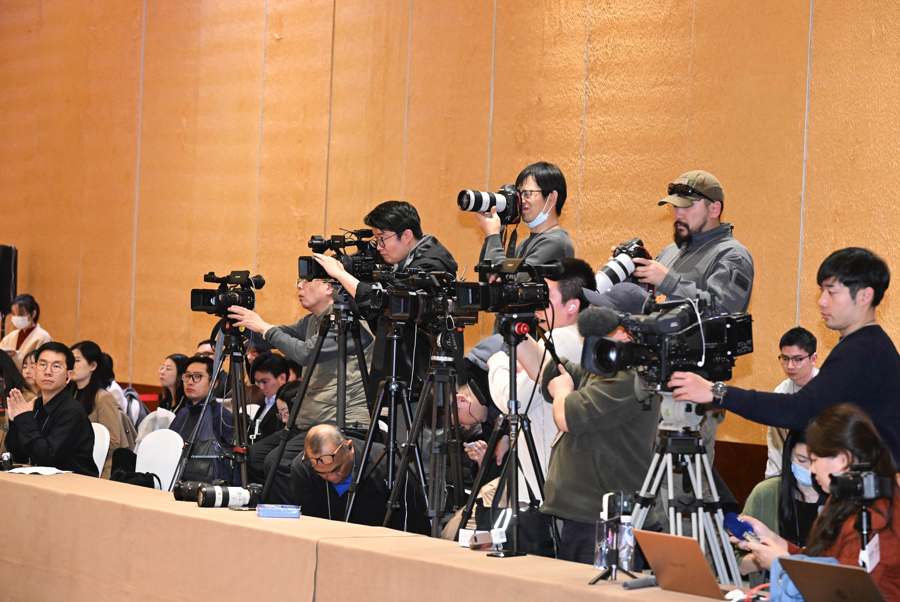 全体会议15时开始。为了占据最佳位置争取提问,不少中外记者14时刚过就来到会场守候,在媒体区架起一排排“长枪短炮”。人民日报、新华社、中央广播电视总台、凤凰卫视、联合早报、彭博社、美联社、CNN、路透社等60余家媒体的百余位记者参会,其中包括17家境外媒体。