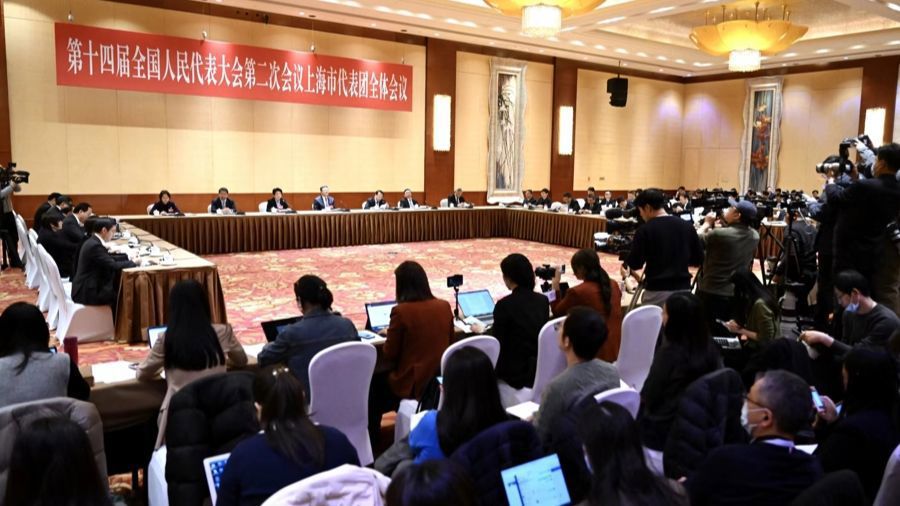 十四届全国人大二次会议上海代表团3月6日下午举行全体会议,审议政府工作报告,对中外媒体开放。市委书记陈吉宁代表,市委副书记、市长龚正代表参加审议。市人大常委会主任、上海代表团团长黄莉新代表主持会议。