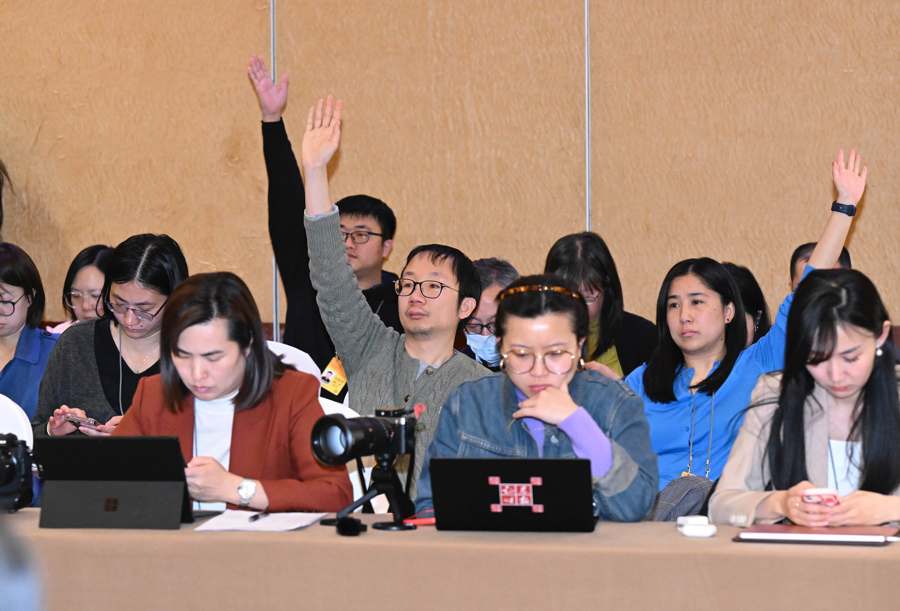 顾军、袁国华、金力、金鹏辉、周桐宇、杭迎伟、印海蓉、李峻、张义民等9位代表审议发言之后,会议进入上海代表与媒体的互动时间。中外记者争相举手寻求提问机会。营商环境优化、跨境数据流动、高水平科技自立自强、长三角一体化、城市更新等成为提问聚焦的重点。