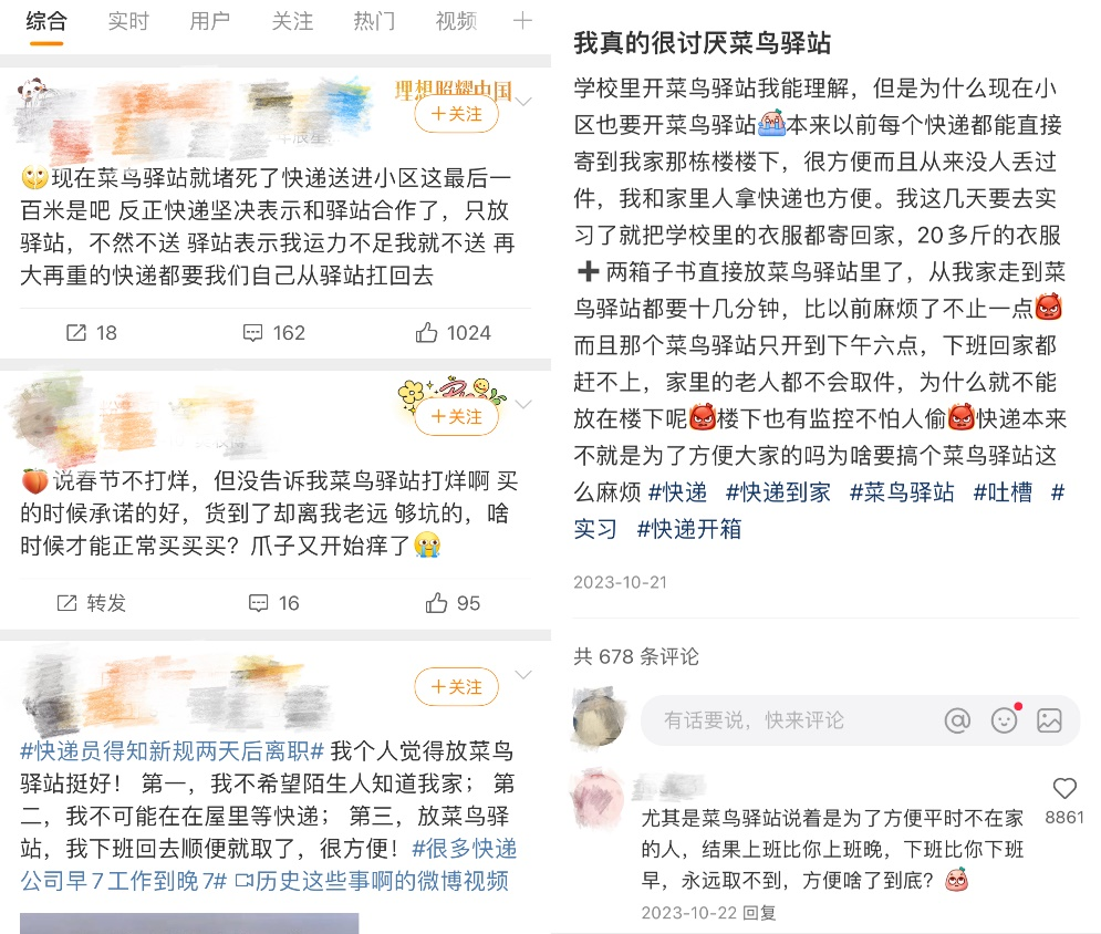打开微博、小红书等社交平台可以看到,消费者对于菜鸟驿站的吐槽与汪茜、周醒类似,但又不止于此。“快递新规”的出台,让快递员、消费者、驿站之间存在着的矛盾无处遁形,亟需解决。
