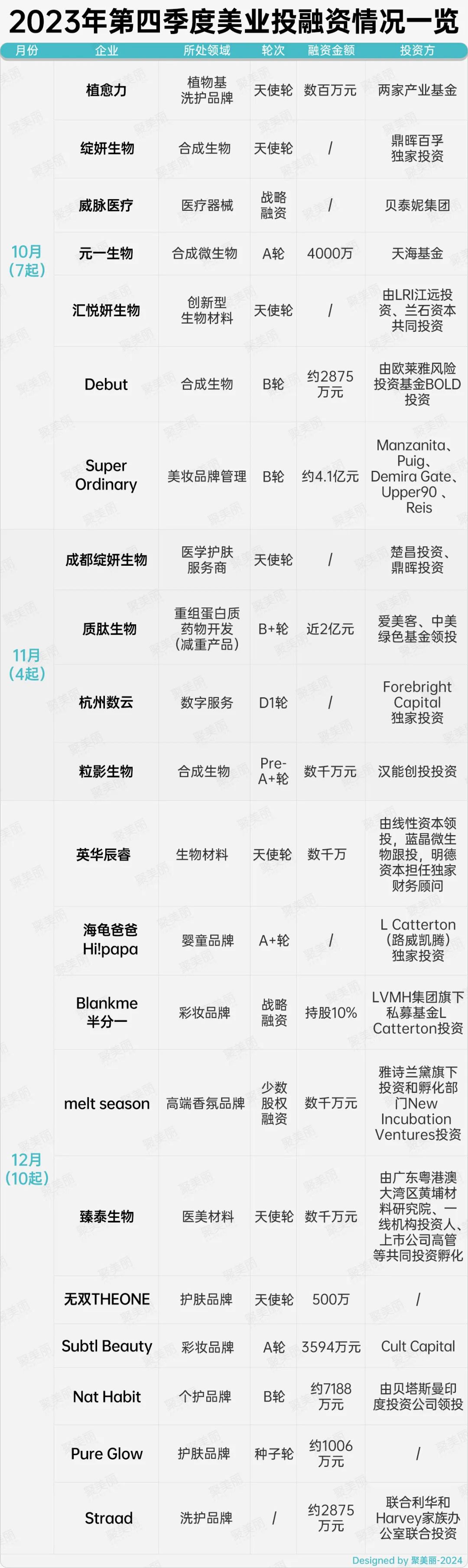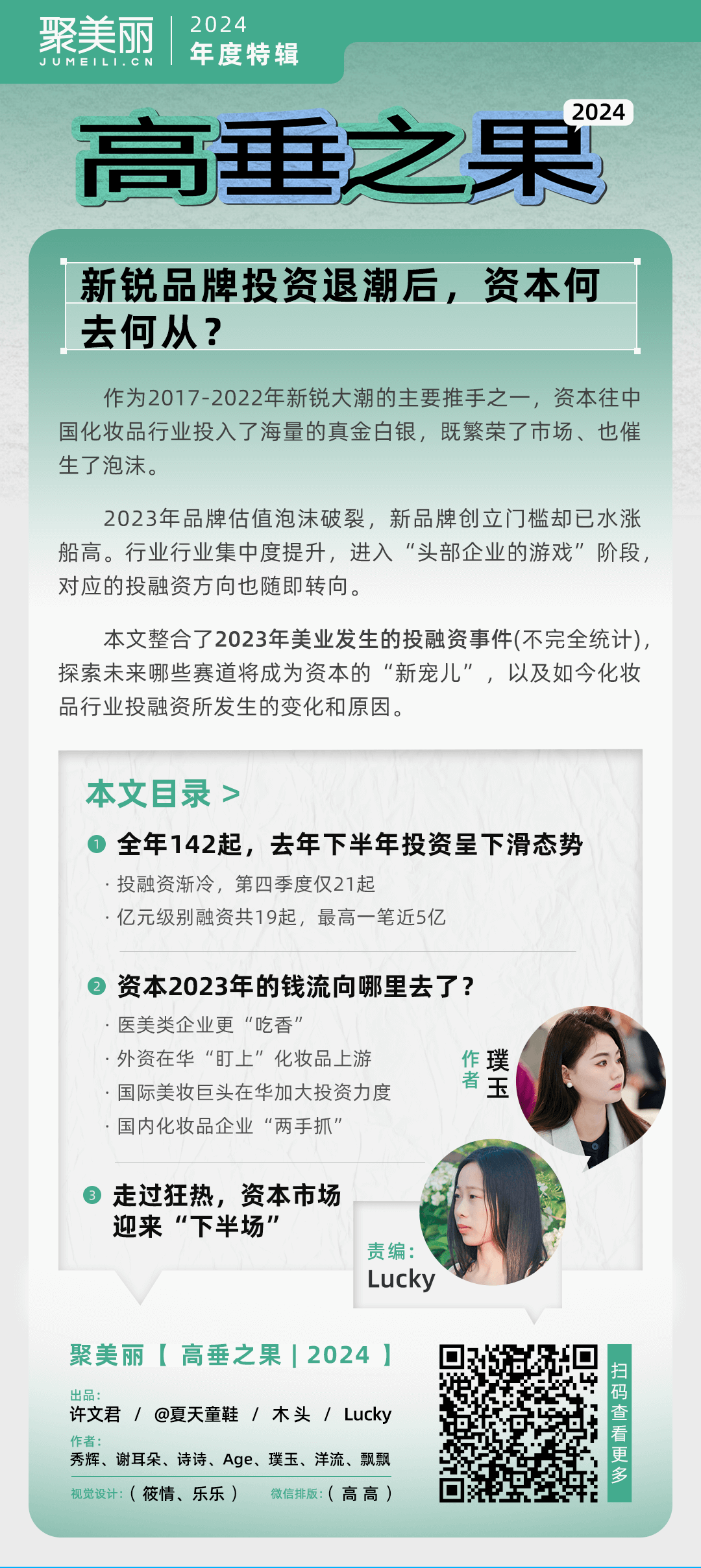 在资本投资缩减的2023年,资本市场对化妆品的投资究竟发生了哪些变化?其中哪些成了资本的“新宠”?未来化妆品投融资上又会有哪些新动向?基于对这些问题的思考,聚美丽梳理了2023年化妆品行业全球投融资事件,并邀请资本方进行交流,从他们的视角来探讨如今化妆品行业投融资所发生的变化和原因。