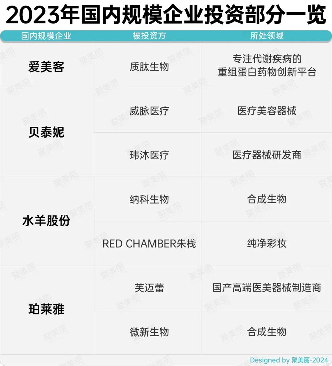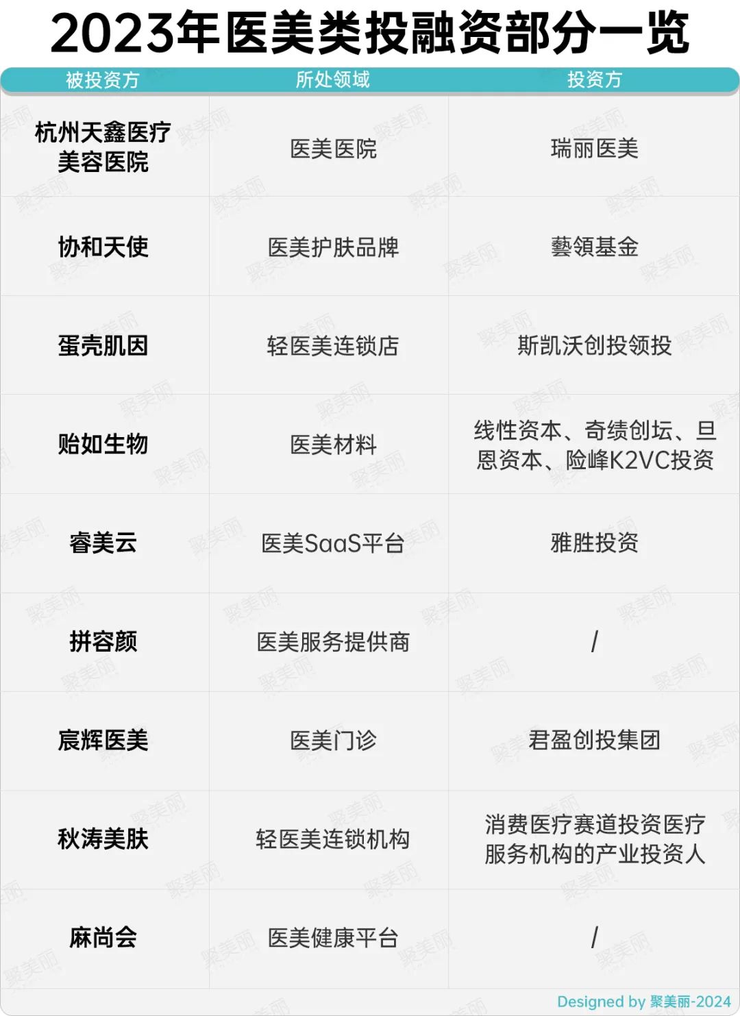 而到了2023年,珀莱雅、贝泰妮等上市企业也相继布局,从医美原料到品牌、门店,再到医美服务平台都被资本投了。