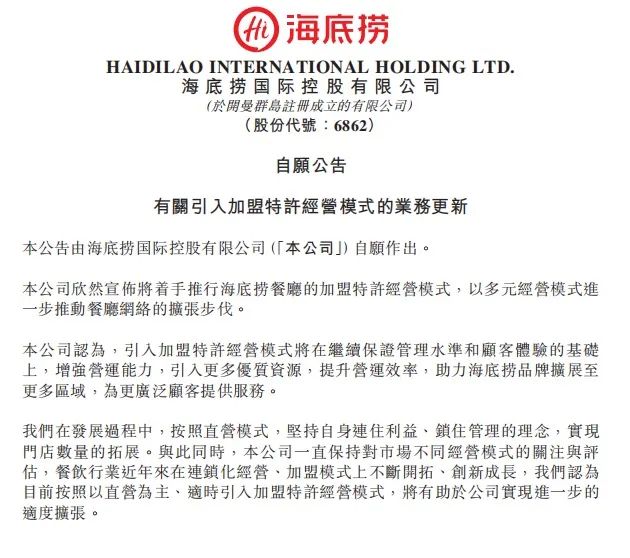 3月4日,一则公告指明海底捞将推行加盟特许经营模式,目标直指“以多元经营模式进一步推动餐厅网络的扩张步伐”。此外,海底捞亦已成立加盟事业部,制定加盟特许经营相关模式细节及商务合作流程。