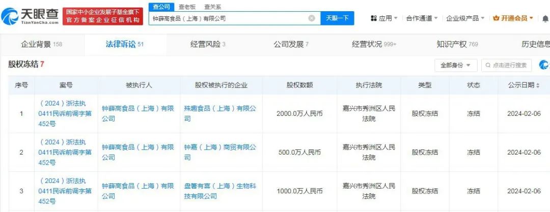 2月6日,钟薛高食品(上海)有限公司新增3则股权冻结信息,冻结股权数额分别为2000万元、1000万元、500万元,股权被执行的企业分别为殊趣食品(上海)有限公司、盘箸有喜(上海)生物科技有限公司、钟嘉(上海)商贸有限公司,冻结期限自2024年2月6日至2027年2月5日。