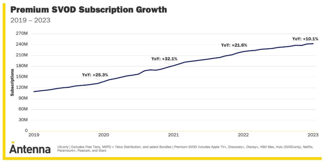 在流媒体行业面临增长瓶颈之际,迪士尼的战略焦点转移无疑是明智之举。根据研究机构Antenna在27日发布的最新报告,去年美国高级订阅视频点播(Premium SVOD)的年增长率降至10.1%,比2022年录得的21.6%减缓了一倍以上。这一统计类别包含Netflix、Disney+和Apple TV+等主要流媒体服务,显示该领域的高速成长期已基本划上句点。